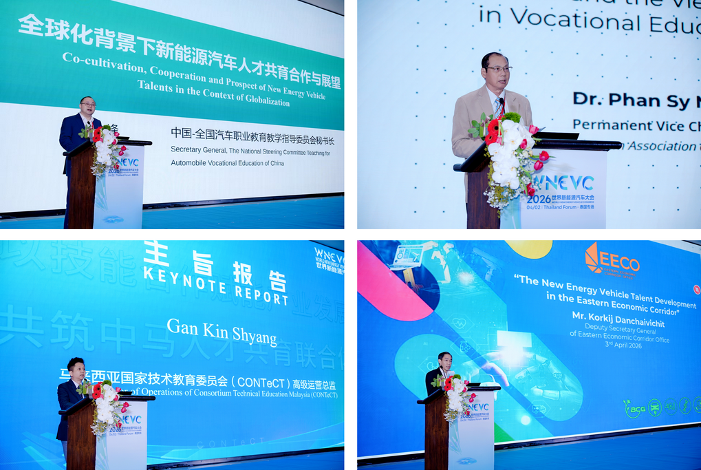 From April 2 to 4, 2026, the 2026 World New Energy Vehicle Conference (Thailand Session) and International Cooperation Summit on Talent Development was successfully held in Bangkok, Thailand. Coinciding with the 5th anniversary of the China–ASEAN Comprehensive Strategic Partnership, the conference was jointly organized by the World New Energy Vehicle Development Organization, the China Society of Automotive Engineers, and the National Steering Committee for Automotive Vocational Education of China.