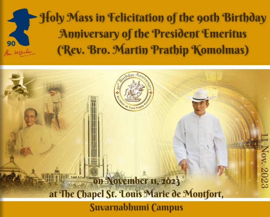 Assumption University of Thailand (AU) proudly celebrated the 90th birthday of its esteemed President Emeritus, Reverend Brother Martin Prathip Komolmas, on November 11, 2023. The grand celebration took place at The Chapel St. Louis Marie de Montfort on the Suvarnabhumi Campus, marked by a holy mass led by His Eminence Cardinal Michael Michai Kitbunchu, Archbishop Emeritus of Bangkok Archdiocese and attended by bishops from around the globe.