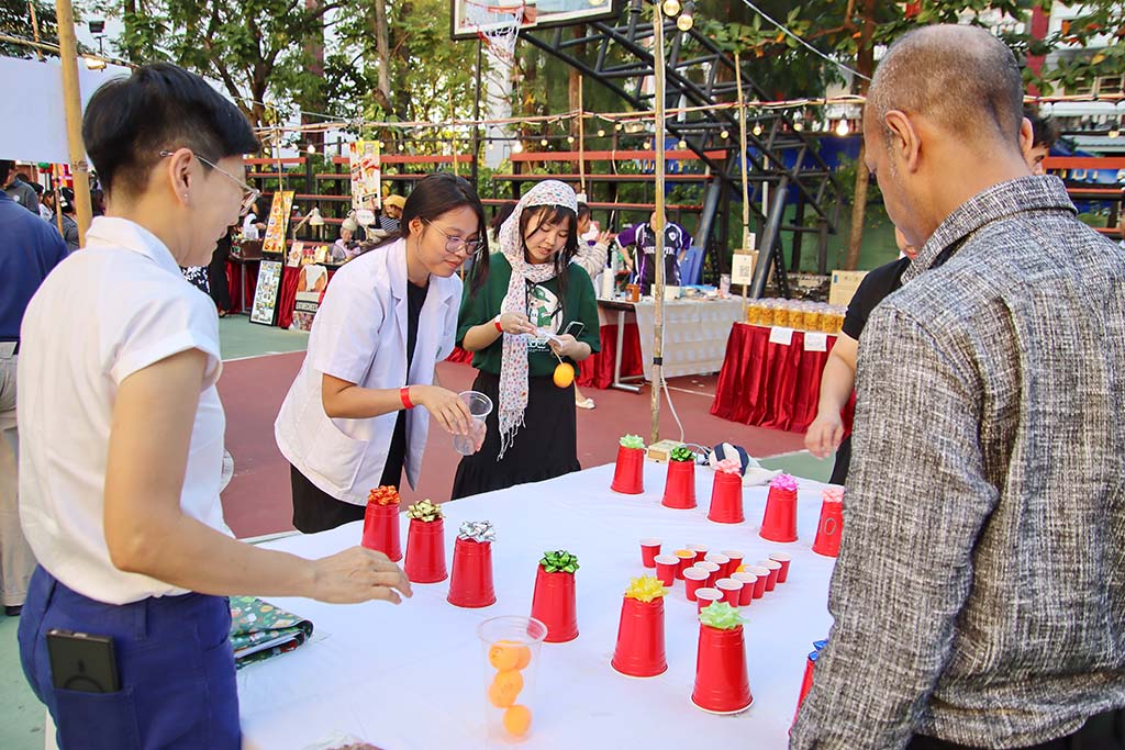 The air was filled with laughter and the spirit of friendship. Guests delighted in a diverse array of food and beverages, alongside creative games hosted by students from various faculties, staff, alumni, and the surrounding Hua Mak Community. Adding to the enchantment, live musical performances by students from School of Music (AMBER) perfectly complemented the night, filling the air with melodies of joy. It was a time for everyone to share beautiful moments, forge new friendships, and reflect on the year’s journey, truly embodying the concept of “Across Memories.”