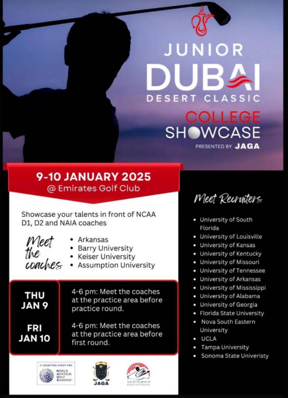 The JAGA College Showcase is being held in conjunction with the prestigious Junior Dubai Desert Classic, presenting a unique opportunity for JAGA students and top junior golfers across Asia. This event will be attended by college golf coaches and representatives from the top universities across the United States and Asia.