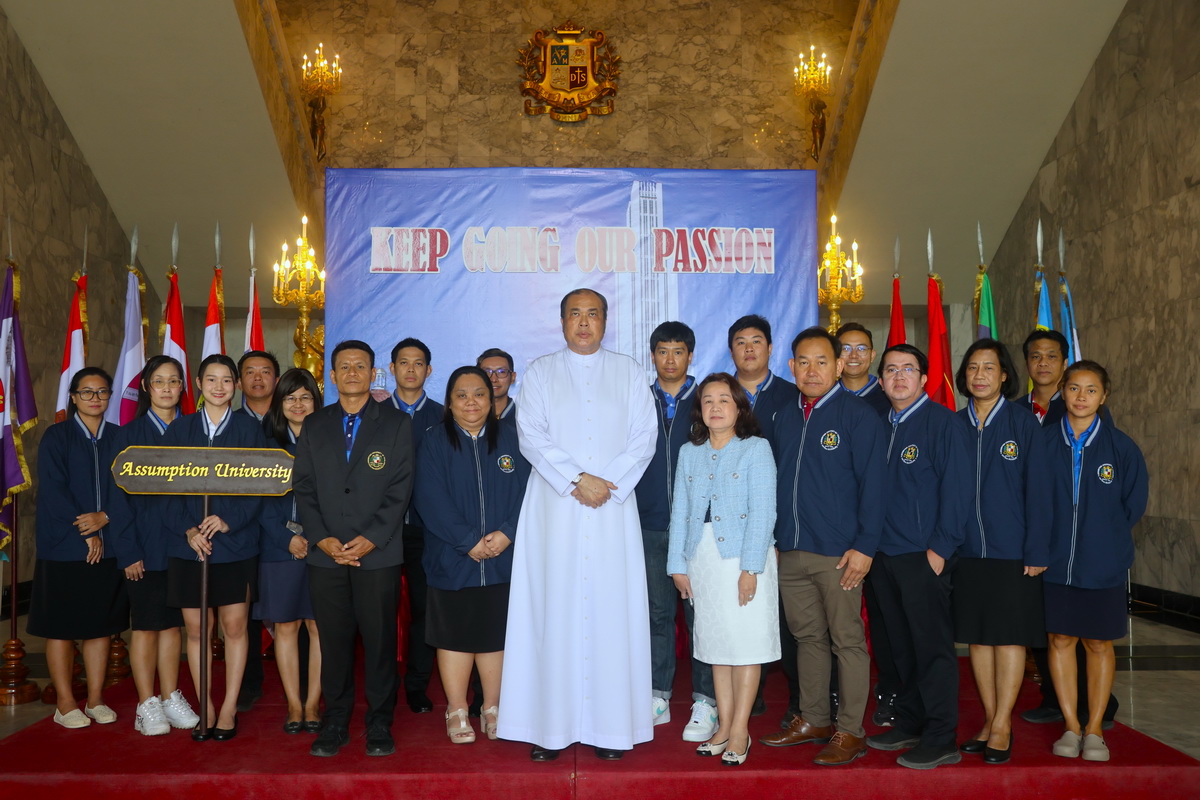 Assumption University of Thailand (AU) came together today to cheer on its athletes as they prepare to compete in the 50th Thailand University Games, “Thammasat Games.” The Blessing Ceremony, organized by the Center for Sports and Physical Fitness, Student Affairs, was held at the CL Lobby, The Cathedral of Learning Building, Suvarnabhumi Campus.