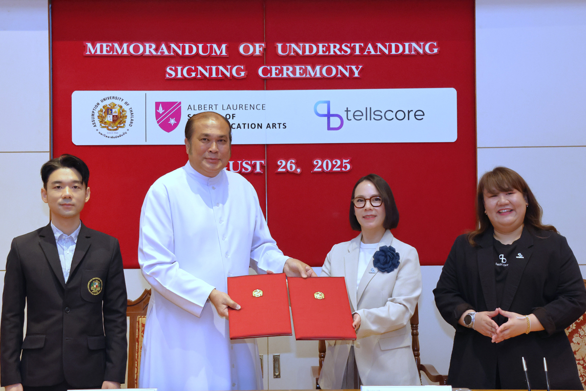 Bangkok, August 26, 2025 – Assumption University of Thailand (AU), through its Albert Laurence School of Communication Arts, officially signed a Memorandum of Understanding (MoU) with Tellscore Company Limited, one of Thailand’s leading influencer marketing platforms. The ceremony took place at the Cathedral of Learning, Suvarnabhumi Campus, marking a milestone collaboration designed to bridge academia and the fast-growing digital communication industry.