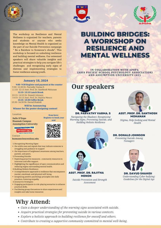 Assumption University of Thailand (AU), in collaboration with the Asia Pacific School Psychology Association (APSPA), proudly reflects on the tremendous success of yesterday’s workshop titled “Building Bridges: A Workshop on Resilience and Mental Wellness.” Held at the Salle d’ Expo Room, Assumption Hall on the Hua Mak Campus, the event marked a significant stride in our commitment to enhancing mental health and resilience in our community.