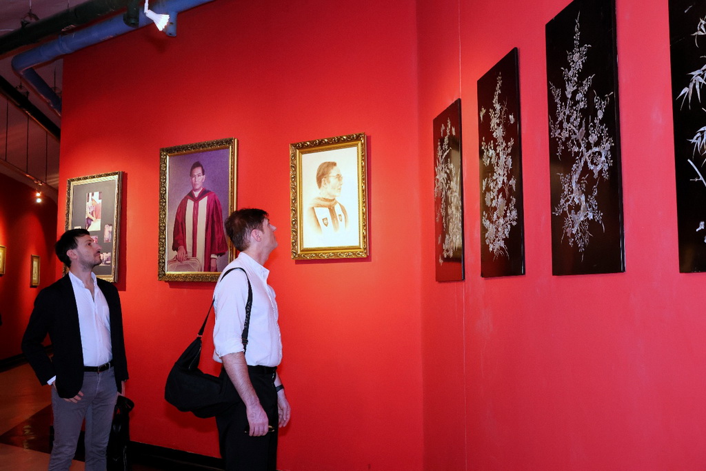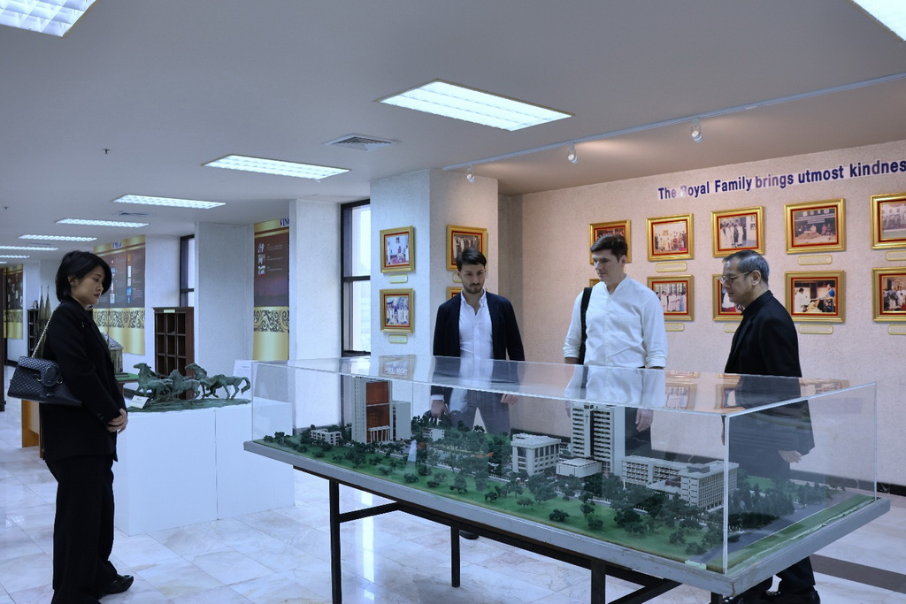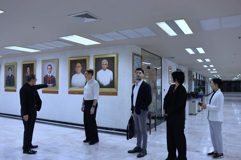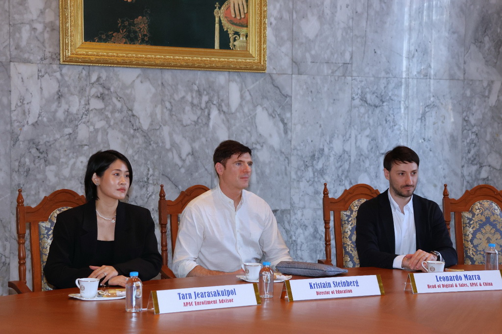 The delegation included Mr. Kristian Steinberg, Director of Education; Mr. Leonardo Marra, Head of Digital and Sales for APAC and China; and Ms. Tarn Jearasakulpol, APAC Enrollment Advisor. They were greeted at Sala Jaturamukpaichit by representatives from AU’s Public Relations and Office of International Affairs teams and toured key university landmarks, including The Chapel of St. Louis Marie de Montfort , The Cathedral of Learning, and the AU Museum featuring the Resonance – Thailand–China Arts Exhibition.