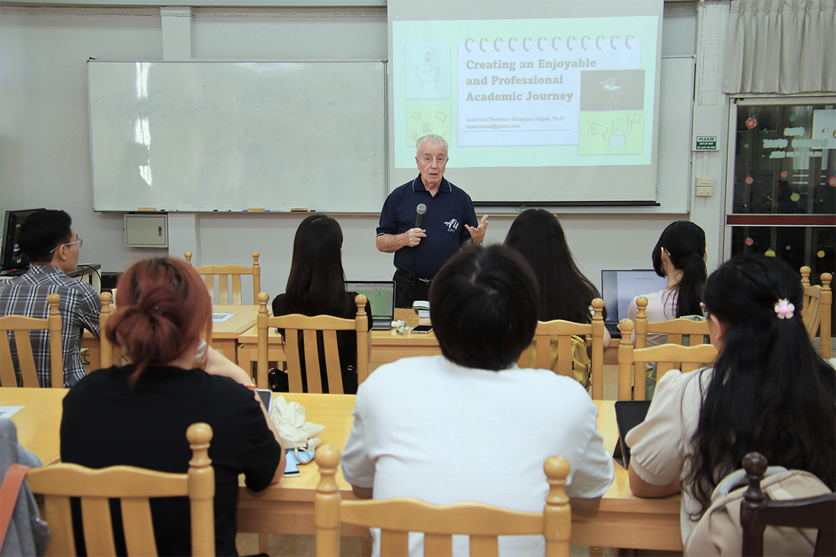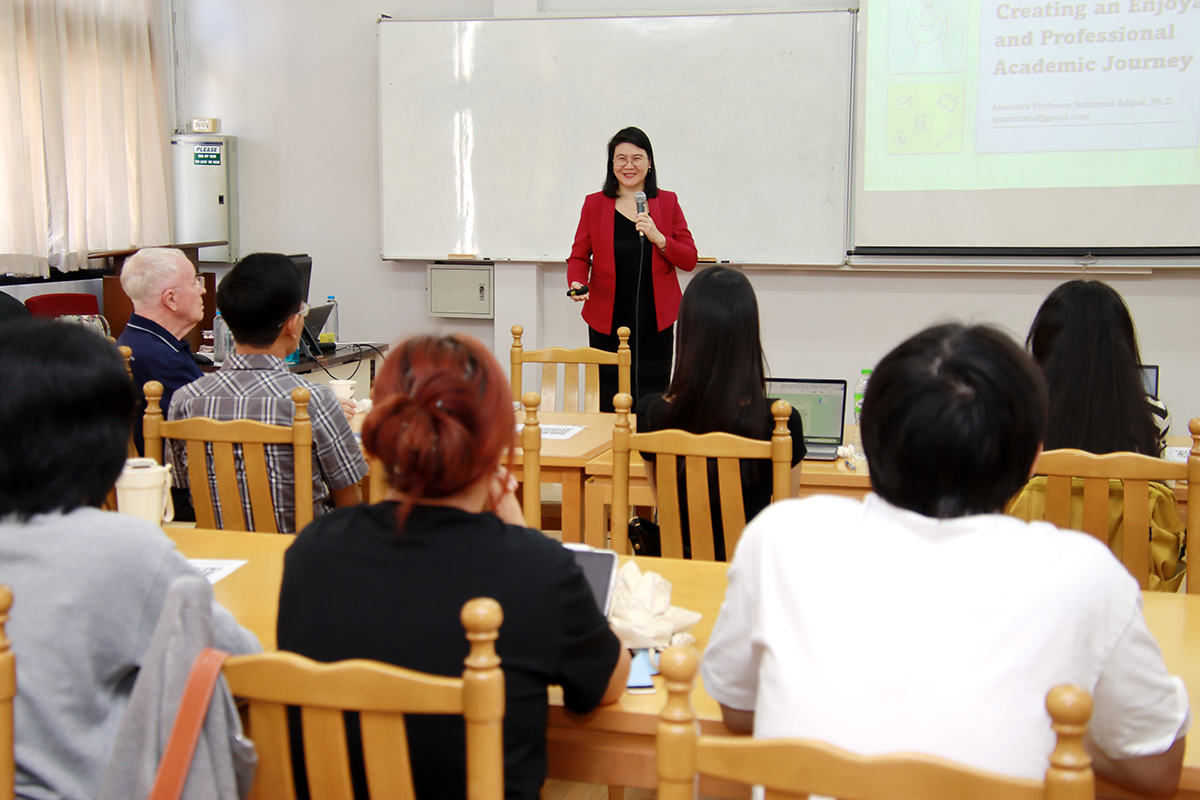 The session was led by Assoc. Prof. Surattana Adipat, Ph.D., from the Faculty of Education, Ramkhamhaeng University. Drawing from her extensive expertise, Dr. Surattana explored practical strategies for fostering a fulfilling academic experience that harmonizes professionalism with enjoyment.