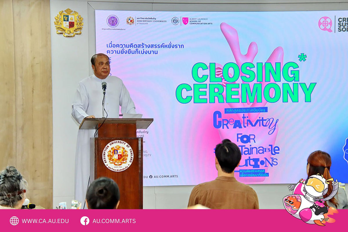 The closing ceremony was presided over by Rev. Bro. Dr. Sirichai Fonseka, President of Assumption University, who delivered the closing remarks and presented the certificates. Asst. Prof. Dr. Nutthaphut Pandjad, Dean of the Albert Laurence School of Communication Arts, hosted the event, congratulated the graduates, and presented eco friendly tote bags as souvenirs, each equivalent to 13 recycled plastic bottles 🎁🌎