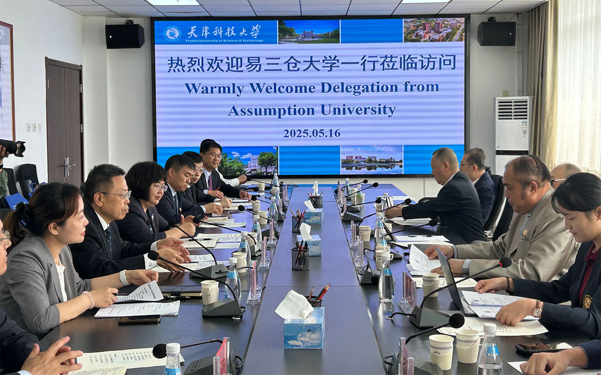 May 16, 2025, Tianjin — A delegation from Assumption University of Thailand (AU) visited the Binhai Campus of Tianjin University of Science and Technology (TUST) on May 16, 2025. High-level talks were held in Room 308 of Yanquan Building, where both sides reached multiple agreements to deepen educational collaboration, promote cultural exchanges, and advance scientific innovation between China and Thailand. The meeting was attended by TUST President Lu Fuping, Vice President Wang Min, and key department heads, alongside AU President Rev. Bro. Sirichai Fonseka, f.s.g. Ph. D.,Vice President Asst. Prof. Dr. Kitti Phothikitti, and other representatives.