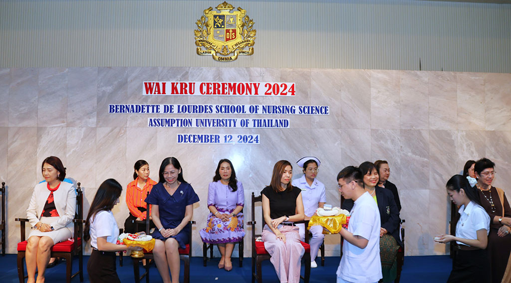 On December 12, 2024, the Bernadette de Lourdes School of Nursing Science (BLNS) at Assumption University of Thailand (AU) hosted its Wai Kru ceremony at De Montfort Hall, Hua Mak Campus. The event, held from 4:00 PM to 7:00 PM, brought together students, faculty, and guests to celebrate a cherished Thai tradition.
