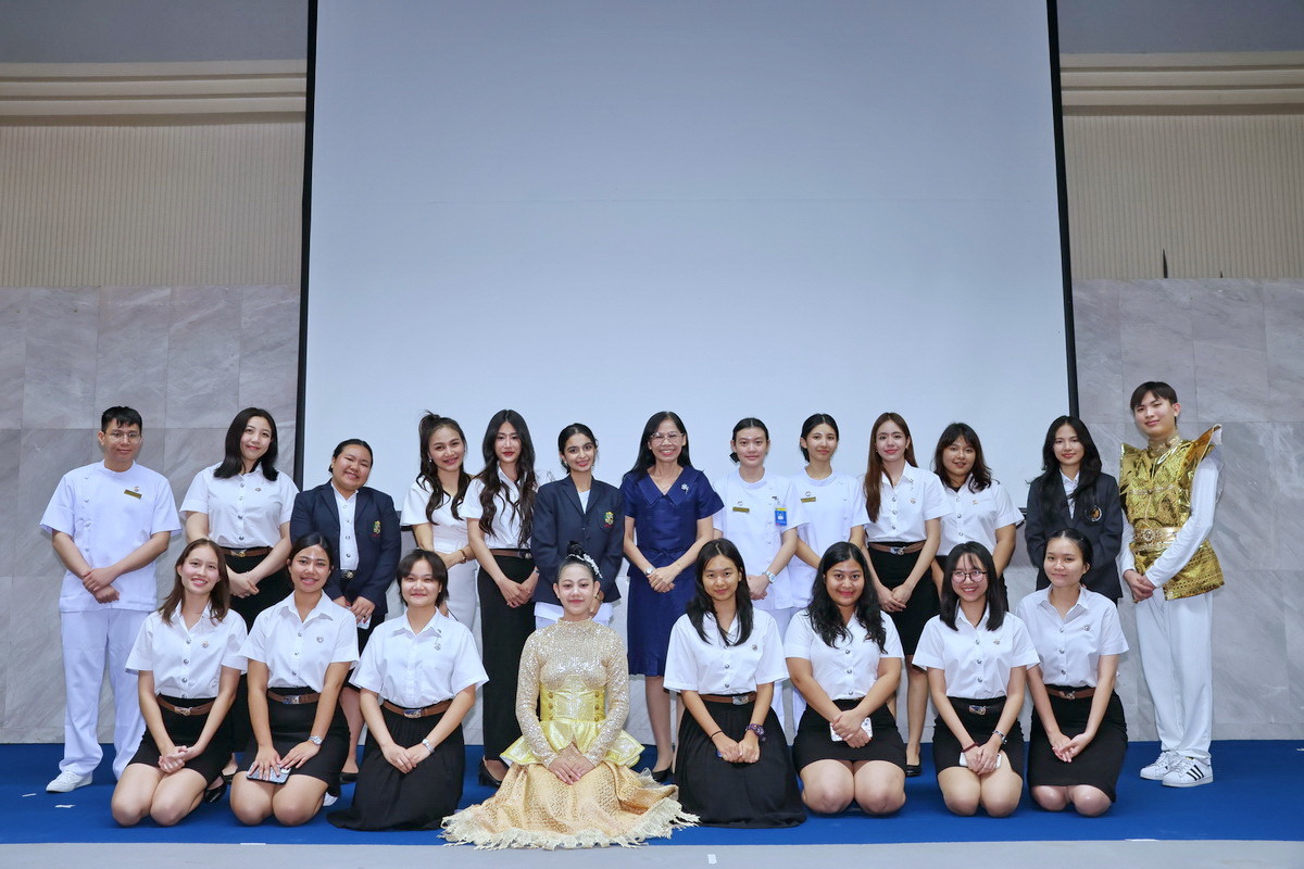 The ceremony began with a grand procession led by students carrying beautifully arranged offerings. The atmosphere in the auditorium was serene, with traditional Thai decorations adding to the sense of occasion. A candle-lighting ritual symbolized the pursuit of knowledge and enlightenment.