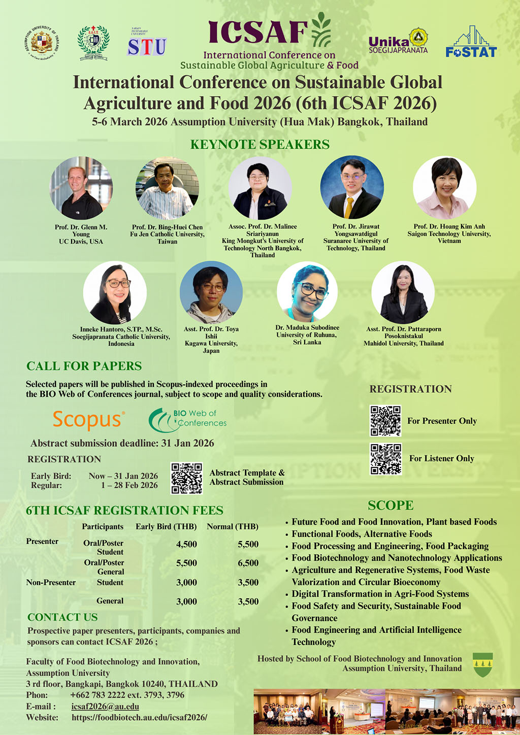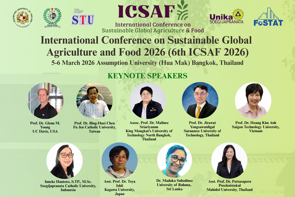 The Theophane Venard School of Food Biotechnology and Innovation at Assumption University of Thailand (AU) announced the 6th International Conference on Sustainable Global Agriculture and Food (ICSAF 2026), to be held on March 5–6, 2026, at the AU’s Hua Mak Campus in Bangkok.