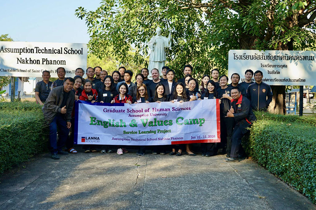 As part of the courses Seminar in Teacher Educational Ethics and Seminar in Educational Administration and Leadership, 19 graduate students from the Graduate School of Human Sciences at Assumption University of Thailand (AU) participated in a service-learning project at Assumption Technical School Nakhon Phanom on January 10–11, 2026. The project was led by Asst. Prof. Dr. Poonpilas Asavisanu and Dr. Timothy Scott.