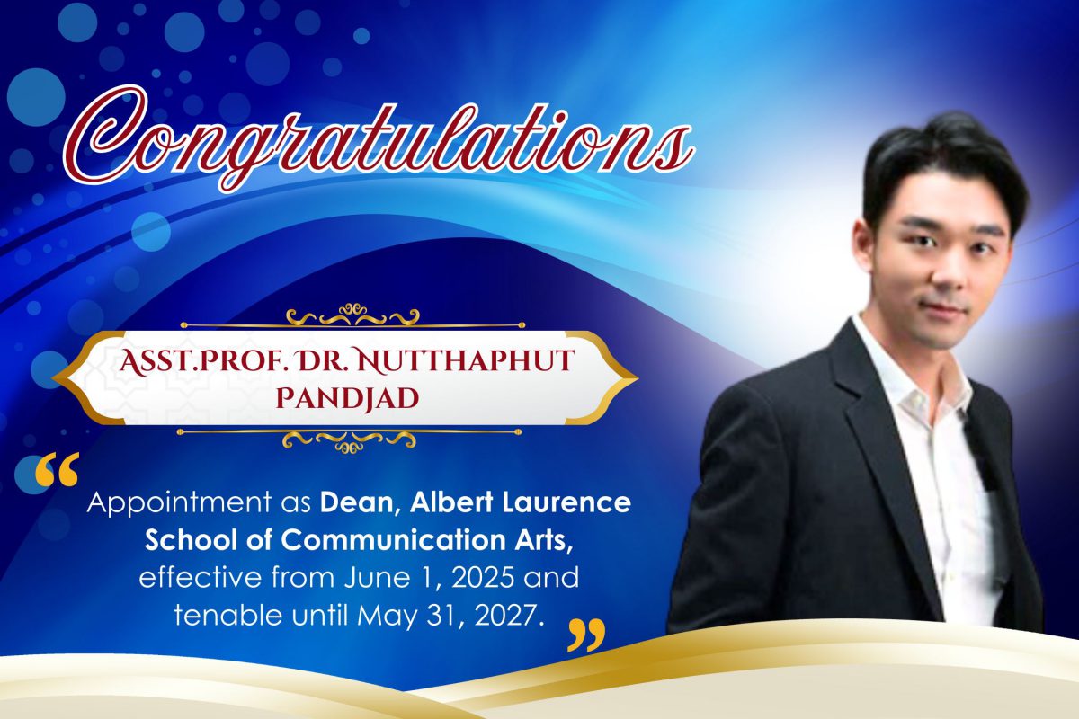 Named Dean of the Albert Laurence School of Communication Arts, Asst. Prof. Dr. Nutthaphut will oversee a school known for creativity, media innovation, and cross-cultural collaboration. He will assume the position from June 1, 2025 to May 31, 2027, succeeding Dr. Marissa Chantamas.