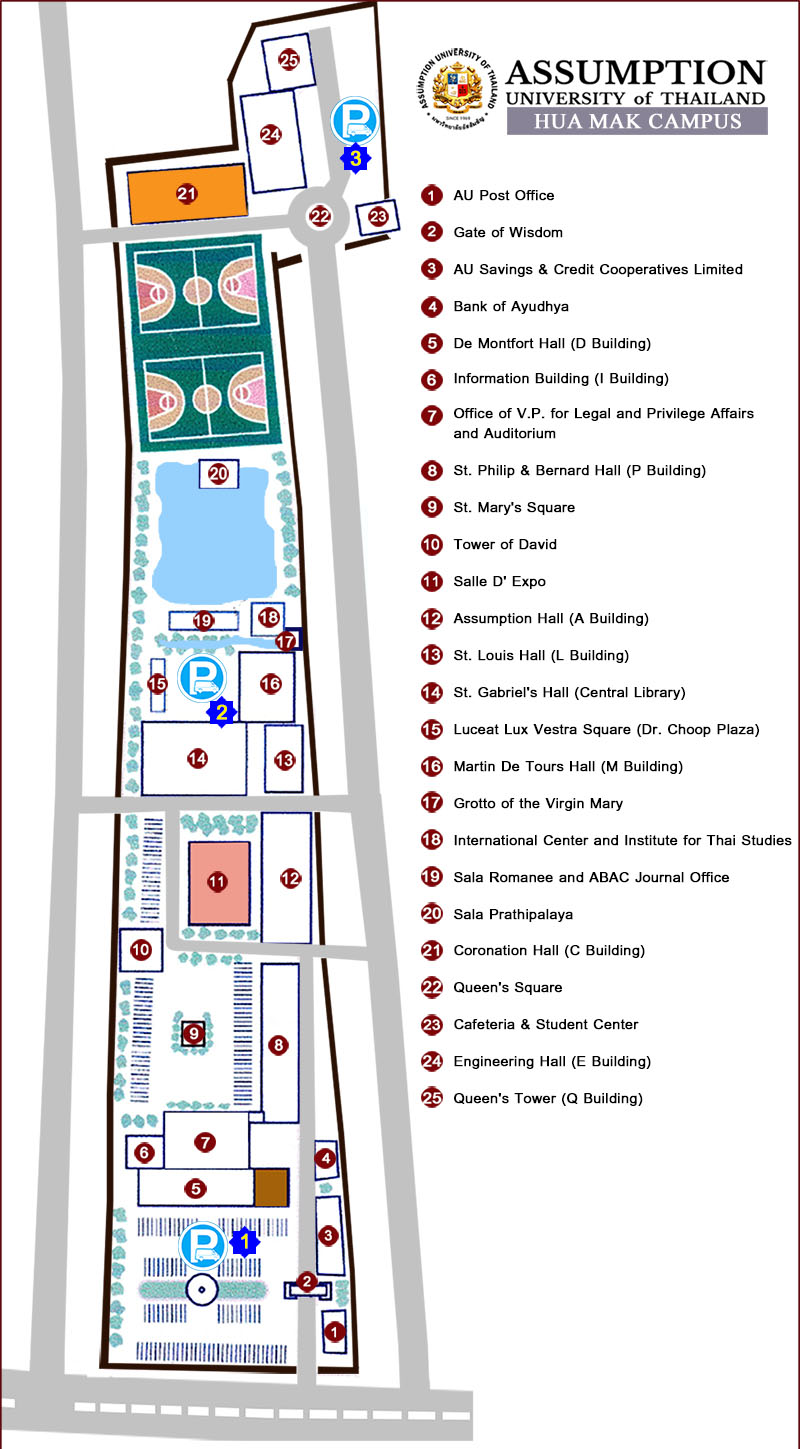 Contact to request a parking sticker for people inside Assumption University and request a parking space for people visiting the university.