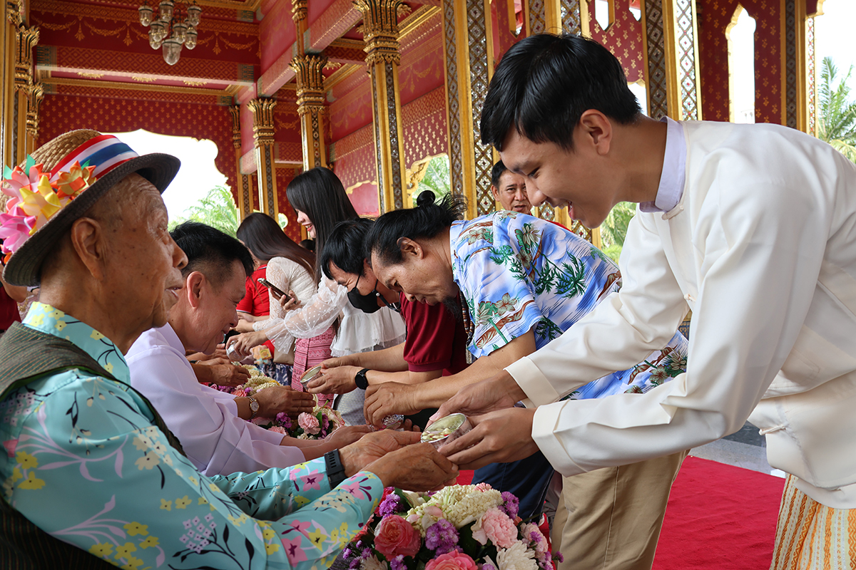 The campus was filled with vibrant Thai fabrics, fragrant flower garlands, and plenty of laughter. Many took time to sprinkle scented water on the Buddha image at AU Plaza, adding a peaceful, spiritual touch to the festivities.