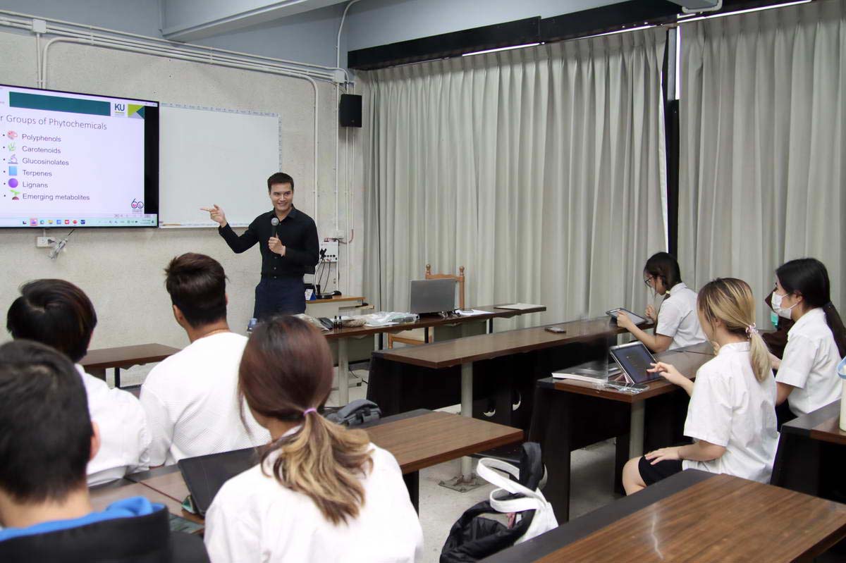 During the lecture, Dr. Kriskamol guided students through the science behind phytochemicals—how they work, where they are found, and why they matter. He shed light on antioxidant mechanisms, toxicity considerations, and the real-world challenges of translating laboratory findings into market-ready food solutions. Students engaged actively, gaining both scientific clarity and deeper appreciation for the potential of plant-based compounds.